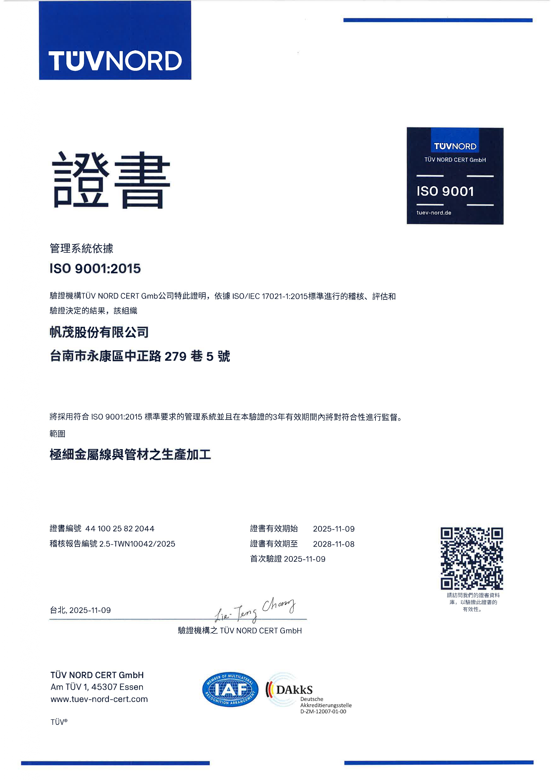 帆茂榮獲ISO 9001:2015認證。
